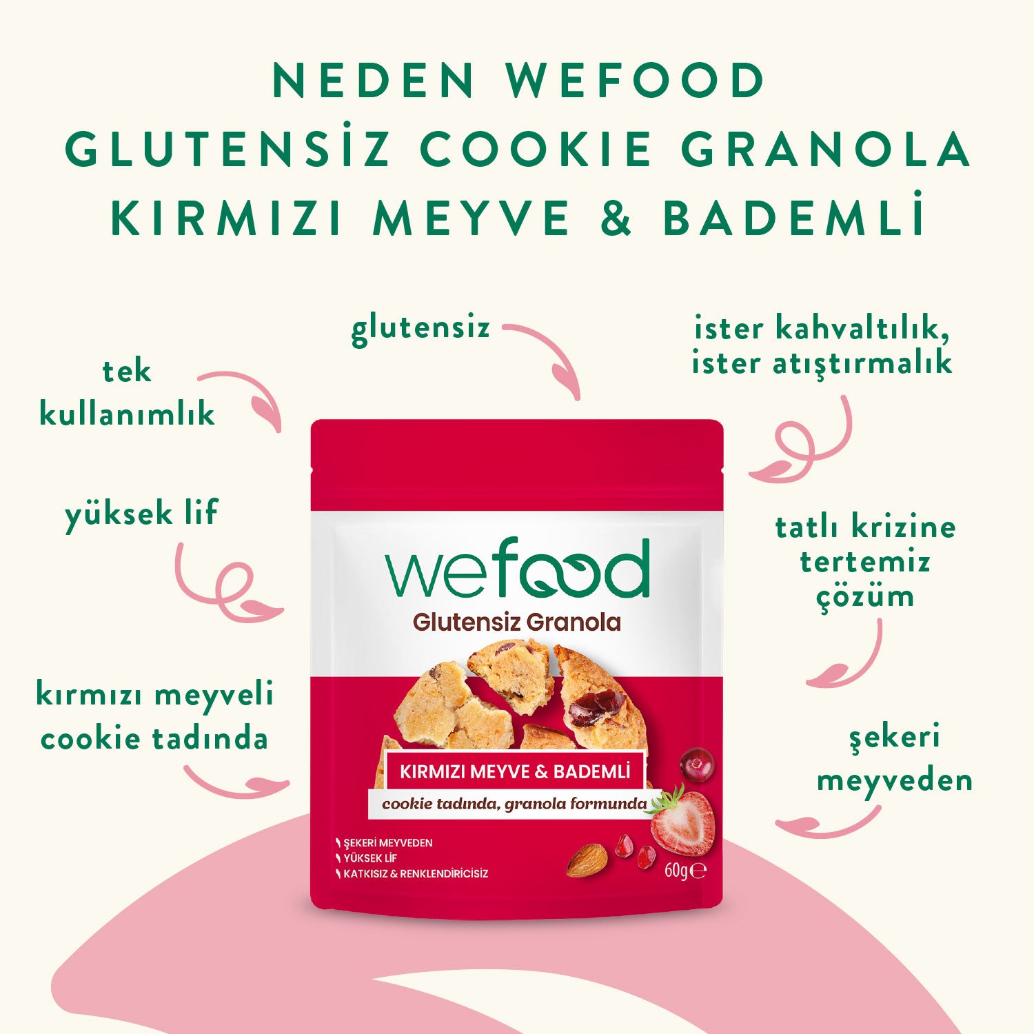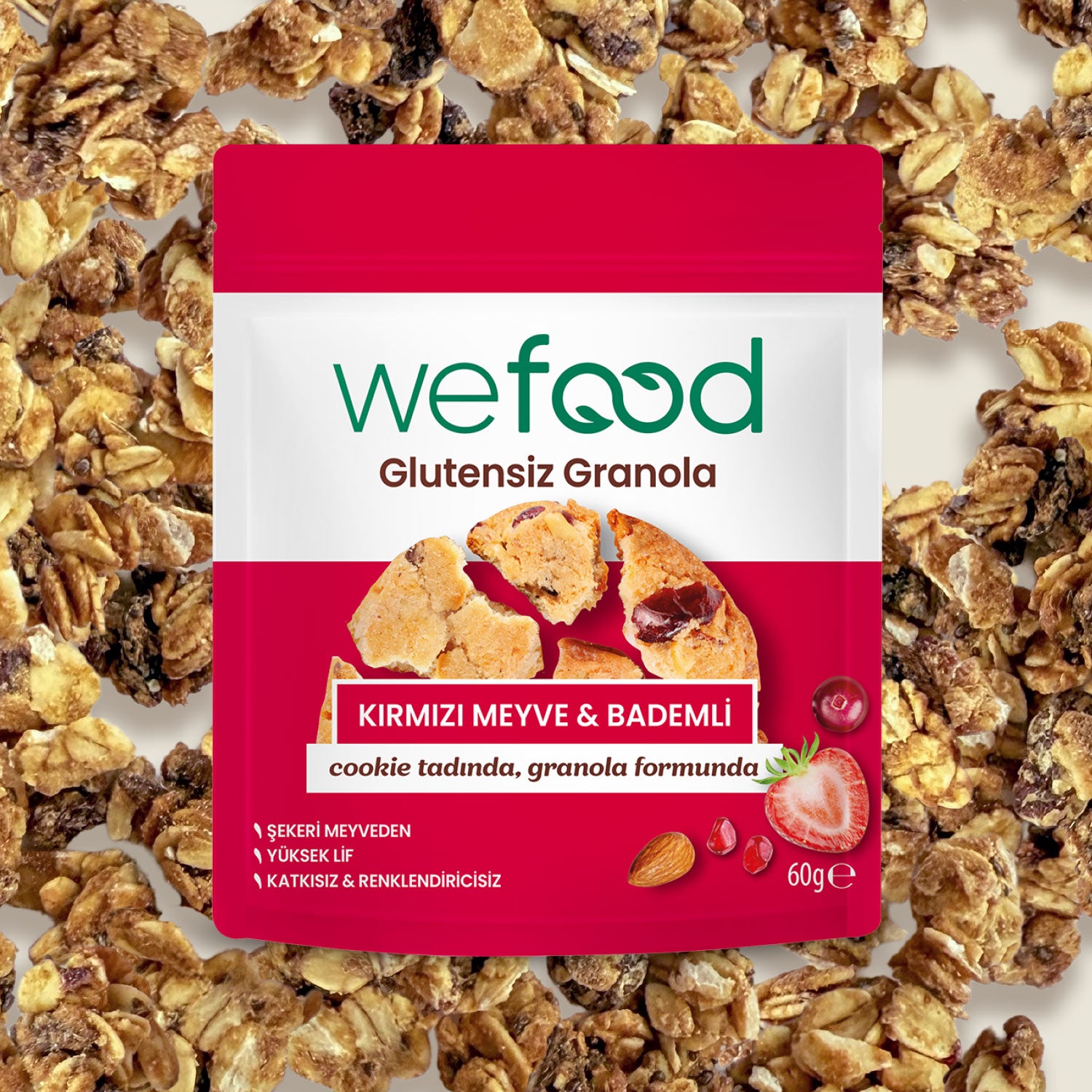 - Yüksek lif içeriğine sahip Wefood Glutensiz Granola Kırmızı Meyve & Bademli, dengeli beslenme hedeflerini desteklemeye yardımcı oluyor. Kırmızı meyvelerin ferahlatıcı tadı ve bademin doyuruculuğu sayesinde uzun süre tok hissetmeye katkı sağlıyor. Tatlı ihtiyacını elma suyu konsantresinden gelen doğal lezzetle karşılamayı mümkün kılıyor. Glutensiz içeriğiyle çölyak hastalığı ve gluten intoleransı olan tüketiciler tarafından da güvenle tercih edilebiliyor. Özellikle kırmızı meyvelerden ve bademden gelen vitamin-mineral içeriğiyle vücudun günlük ihtiyaçlarına katkı sunmaya yardımcı oluyor.