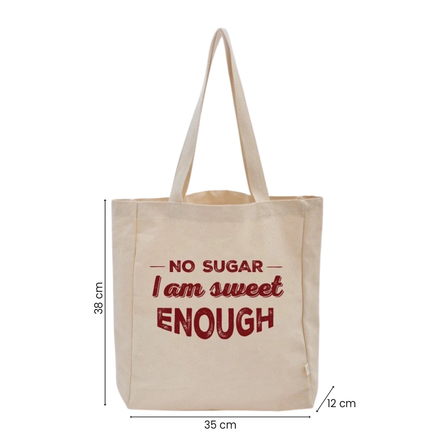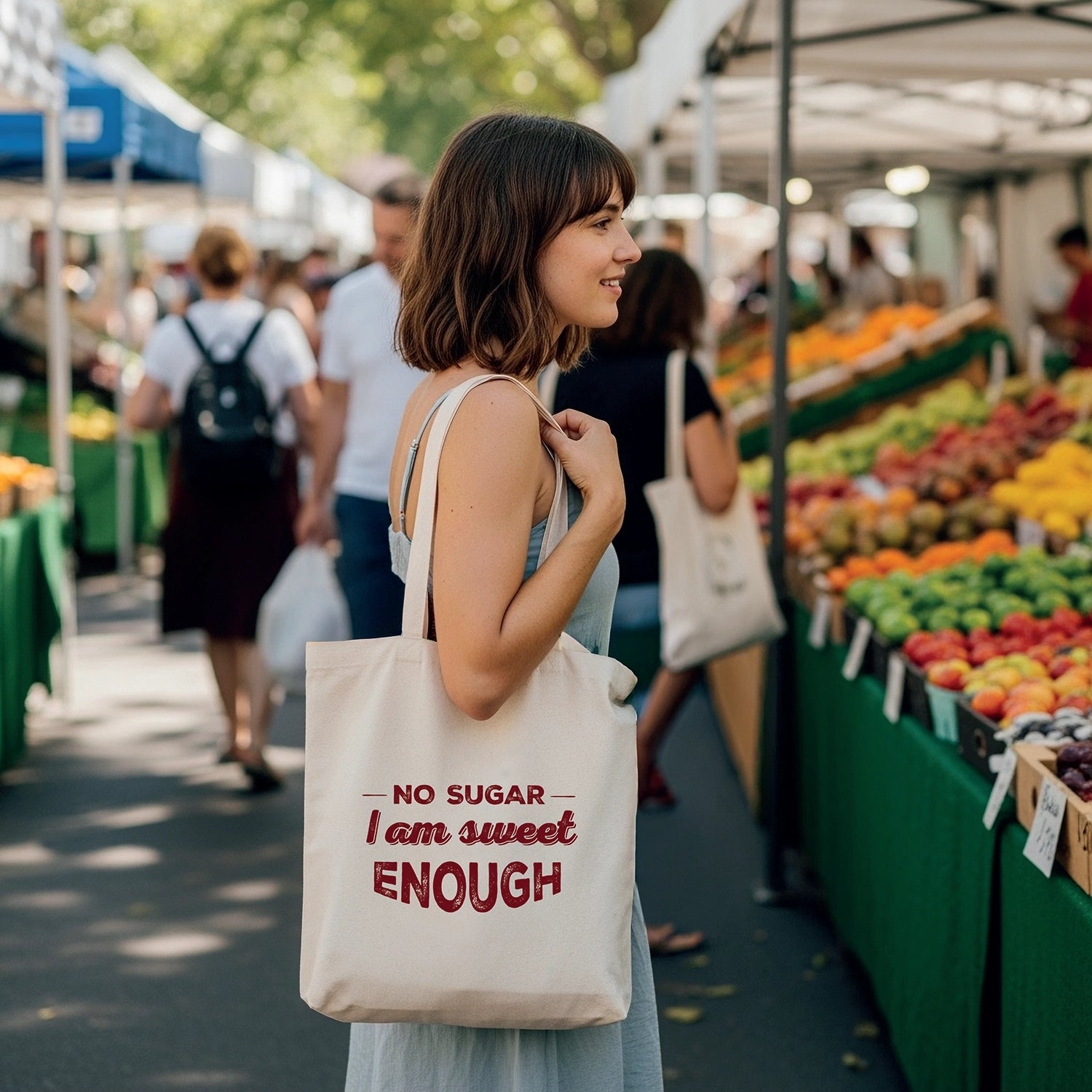 Ham bez renginin doğal görünümü, üzerindeki “No Sugar, I Am Sweet Enough” yazısıyla birleşerek modern, pozitif ve enerjik bir stil yaratır. Böylece çanta; ofis kombinlerinden spor giyime, hafta sonu gezilerinden alışveriş anlarına kadar her ortama kolaylıkla uyum sağlar. Sade ama etkileyici tasarımı sayesinde, ekolojik çanta kullanmak hem şık hem de sürdürülebilir bir deneyime dönüşür.