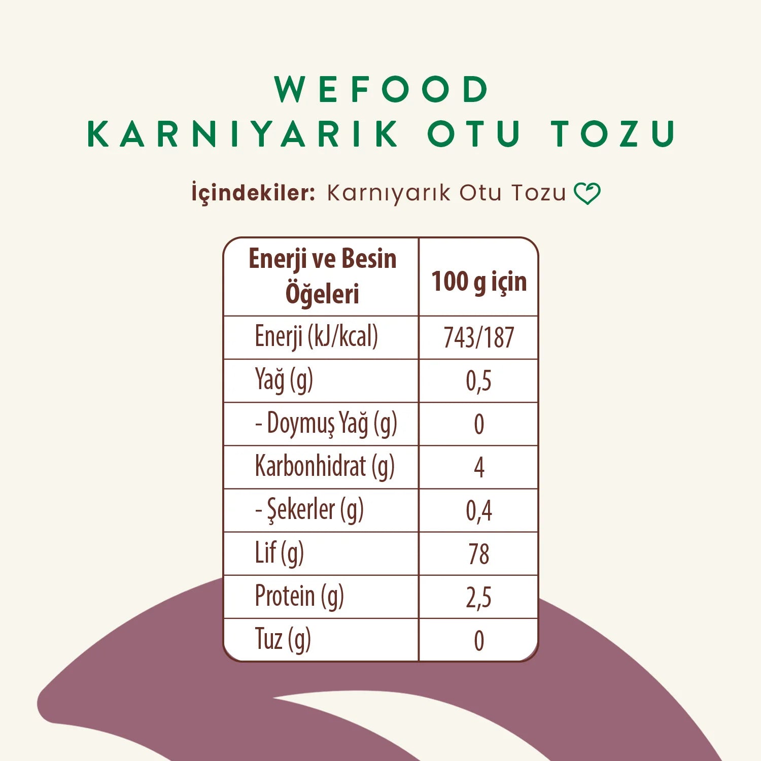 Glutensiz ve doğal içerikli Wefood Karnıyarık Otu Tozu, Hindistan’dan ithal edilip, sadece glutensiz ürünlerin işlendiği değirmenlerde öğütülür.